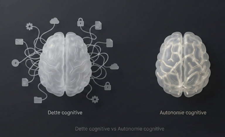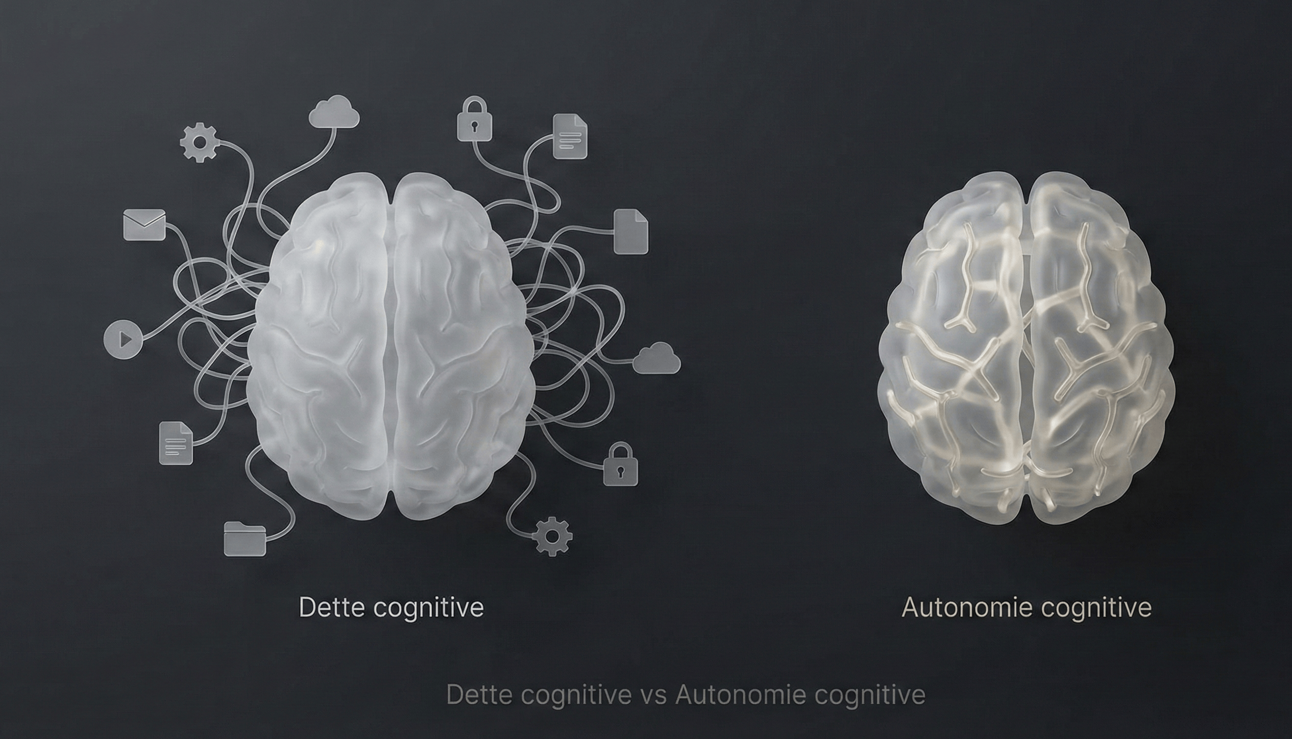 La dette cognitive est l'écart grandissant entre ce que vous produisez et ce que vous comprenez réellement. C'est la dépendance structurelle à des tiers (IA, consultants, outils automatisés) pour générer des résultats que vous seriez incapable de reproduire ou d'expliquer sans eux.